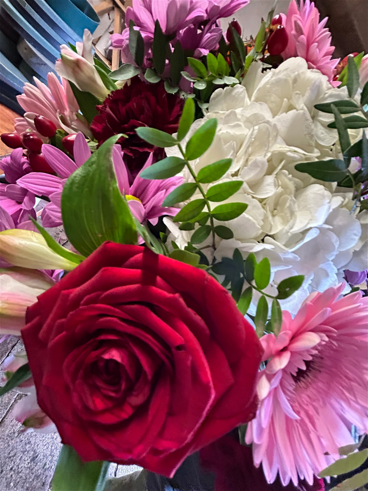 Mixture of flowers which include 3 red roses.
